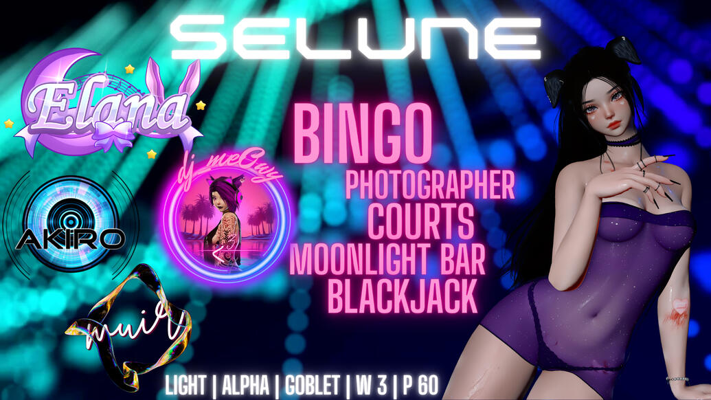 Join the fun at Selune’s Bingo! Cards are sold by our playful Bingopuppy Neru. Grab your lucky numbers and let the night’s magic begin!